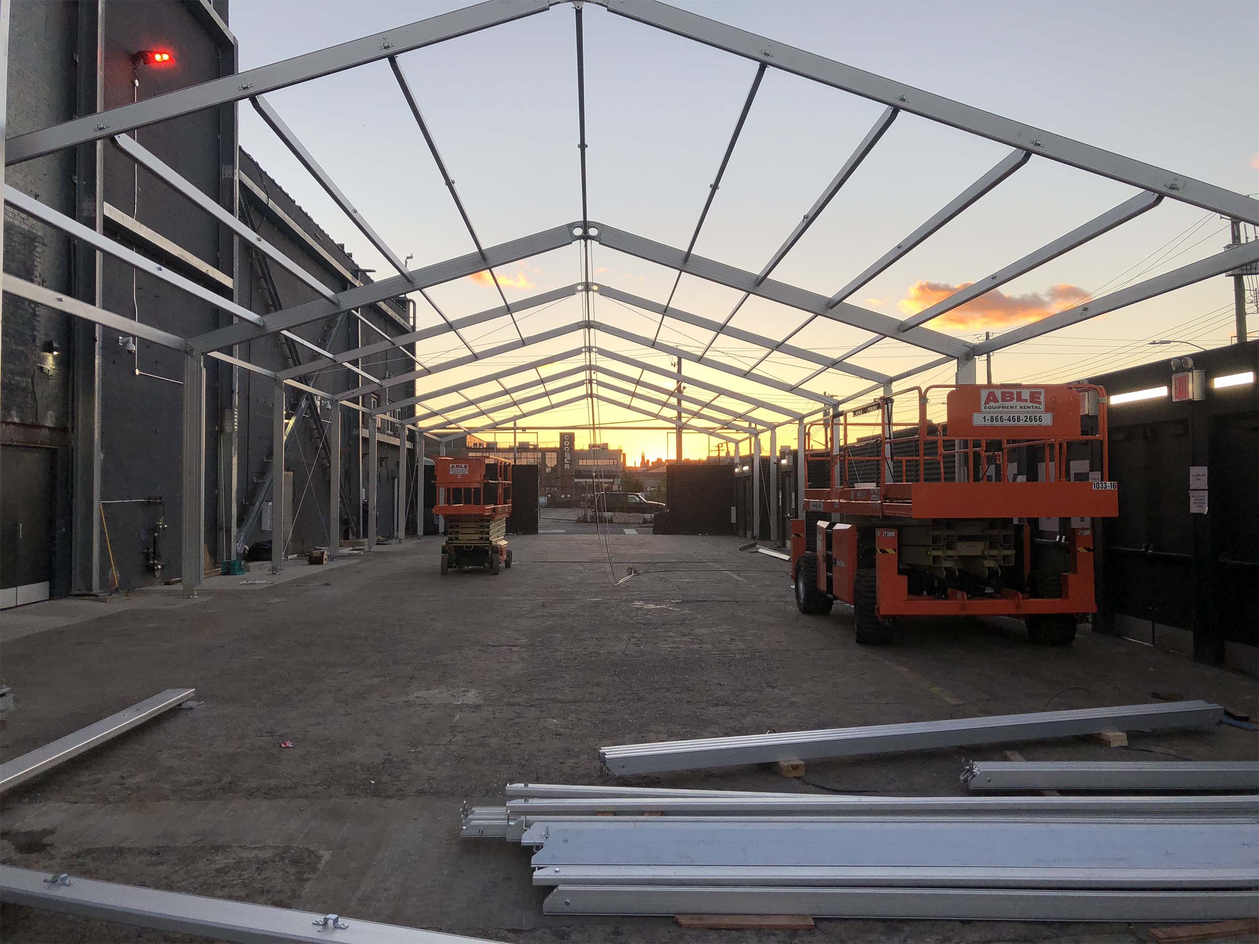 Our temporary warehouse structures accommodate forklift operations, pallet racking, and distribution staging. Overhead doors allow truck access for loading and unloading, while sealed sidewalls prevent water and wind damage to stored materials.